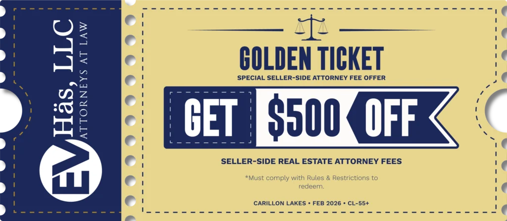 The Golden Ticket is a limited-time attorney fee credit offered by EV Häs, LLC. It provides $500 off eligible seller-side real estate attorney fees when you retain our firm for a qualifying transaction.